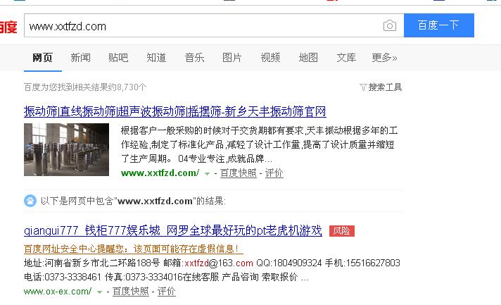 第二條信息,下面的地址,郵箱啊等等資料都是我們新鄉(xiāng)市天豐振動機械公司的,但是打開內容,卻是一個很不的網站,我查看了一下源代碼,沒有我們公司的,這是什么情況呢,然后我又看百度快照信息,結果如下: